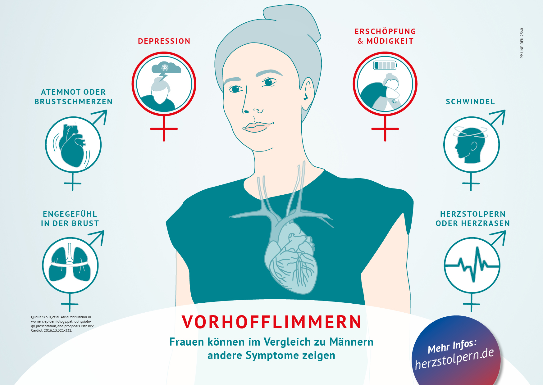 Anzeichen eines VHF sind bei allen Geschlechtern ein schneller oder unregelmäßiger Herzschlag, oft als Herzstolpern oder Herzrasen wahrgenommen, sowie Atemnot, Engegefühl oder Schmerzen in der Brust. Häufiger klagen Frauen über weitere Symptome wie Erschöpfung oder Schwächegefühle.2 Deswegen ist es wichtig, die geschlechtsspezifischen Symptome zu kennen und bei ihrem Auftreten rechtzeitig zu reagieren.6