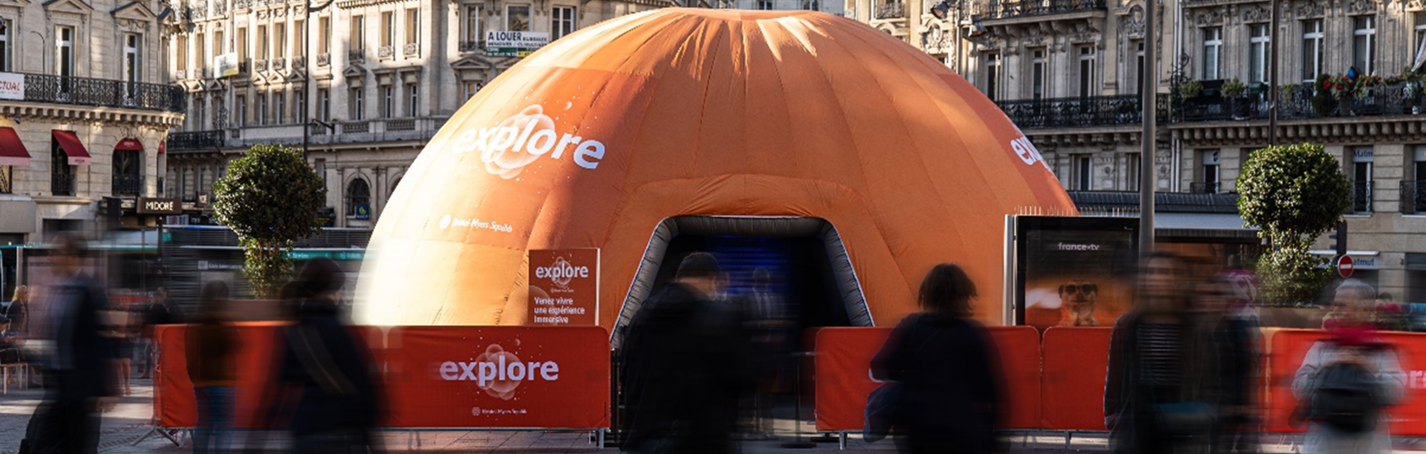 À l’occasion de cette 1ère édition, #ExploreForCancer s’est installé sur le Parvis de la Gare Saint-Lazare pour accueillir le public au cœur d’un dôme aux couleurs d’#ExploreForCancer. L’objectif de ce dispositif : offrir une expérience immersive et ludique pour mieux comprendre le réveil du système immunitaire.