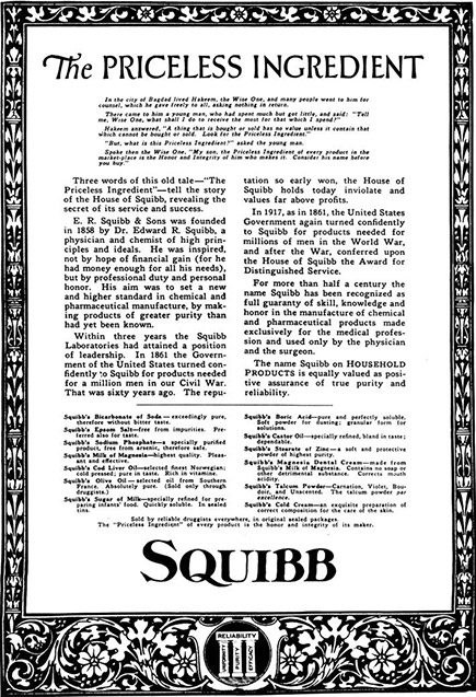 “The Priceless Ingredient” la prima affissione di Bristol Myers Squibb, 1921