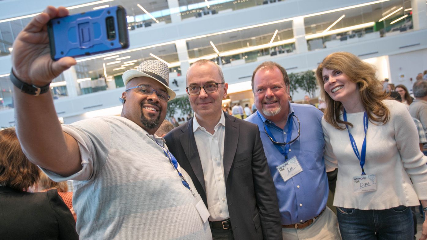 Chairman and CEO Giovanni Caforio, second from left, pictured with Bristol-Myers Squibb patients K.T., Lee and Dina.