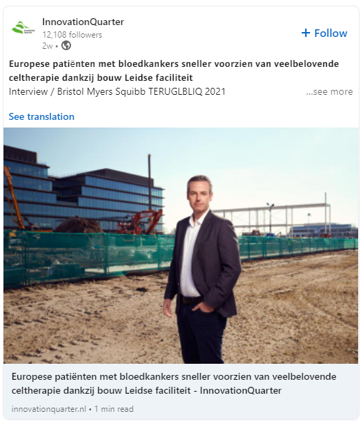 Lees het interview met Arjen Schippers, Senior Director en Program Head of Europe Cell Therapy Facility bij Bristol Myers Squibb over waar hij het afgelopen jaar aan heeft gewerkt met ondersteuning van InnovationQuarter en wat er de komende maanden te verwachten valt.